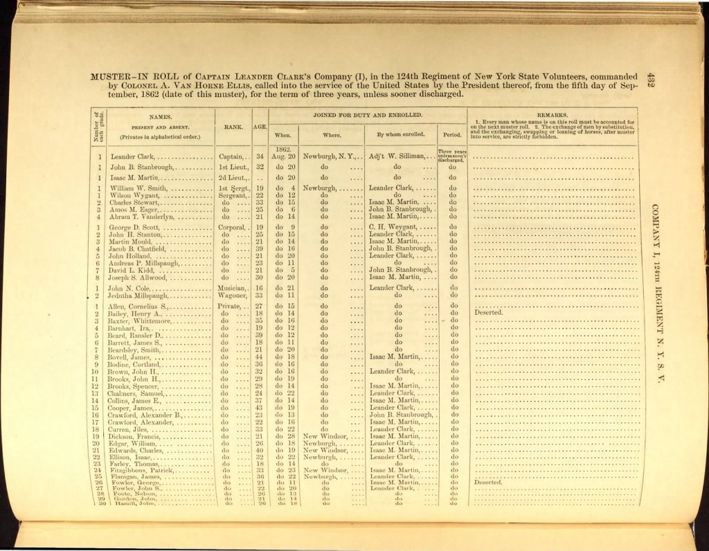 With unrest unfolding and the Civil War beginning, young John H. Brown enlisted as a Private, Co. I, in the 124th NYS Volunteers, remembered more so as the Orange Blossoms, on August 16th, 1962. In the roster of the 124th, he mustered out on June 3rd, 1865, near Washington, DC. The inscription on his grave marker lists Co. C, but in all the records, it is shown as Co. I.