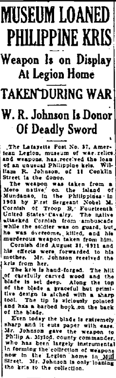 One interesting article I discovered is from the Poughkeepsie Eagle News, September 20th, 1928, edition. Perhaps some of my readers may have knowledge of where this weapon now resides. Gleaned from the article, a kris (a dagger which originated in that area of the world) was obtained when a Moro native ambushed First Sgt. Cornish while he was guard duty. The native was ultimately killed by Noble. The kris apparently was returned with his other possessions when he passed away. The family loaned it to the Lafayette American Legion Post No.37 way back when for display, to be returned to the family.