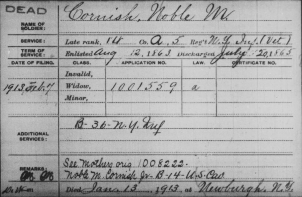 However, when his widow, Mary Jane Roe, filed for the death benefits on February 7th, 1913, the month after his death on August 13th, 1913, his rank is the same, but he’s now in Co. A, Regiment 5. However, digging a bit deeper, into the death benefit records, it appears there may have been a change as a line is crossed out and the letter “A” is now there, he’s now in Co. B, Regiment 36, N.Y. Infantry as well.