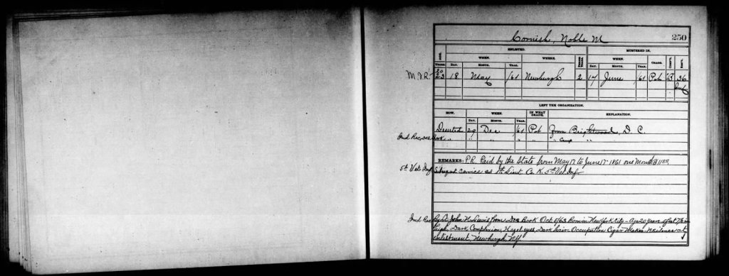 Noble M (Miner) Cornish was born on December 28th, 1840, and was by trade, a cigar maker. When the Civil War engulfed our nation, Nobel heard the call and joined the Union Army on August 12th, 1863, signing up in New York City, enlisting in Co. E, and mustered in with the rank of Corporal on August 28th, 1863. Rising through the ranks, he was commissioned as a 2nd Lt. on July 12th, 1864, and then achieved the rank of 1st Lt. on June 11th, 1865, in Co. I, 8th Regiment of the N.Y. Volunteer Infantry, according to the marker.