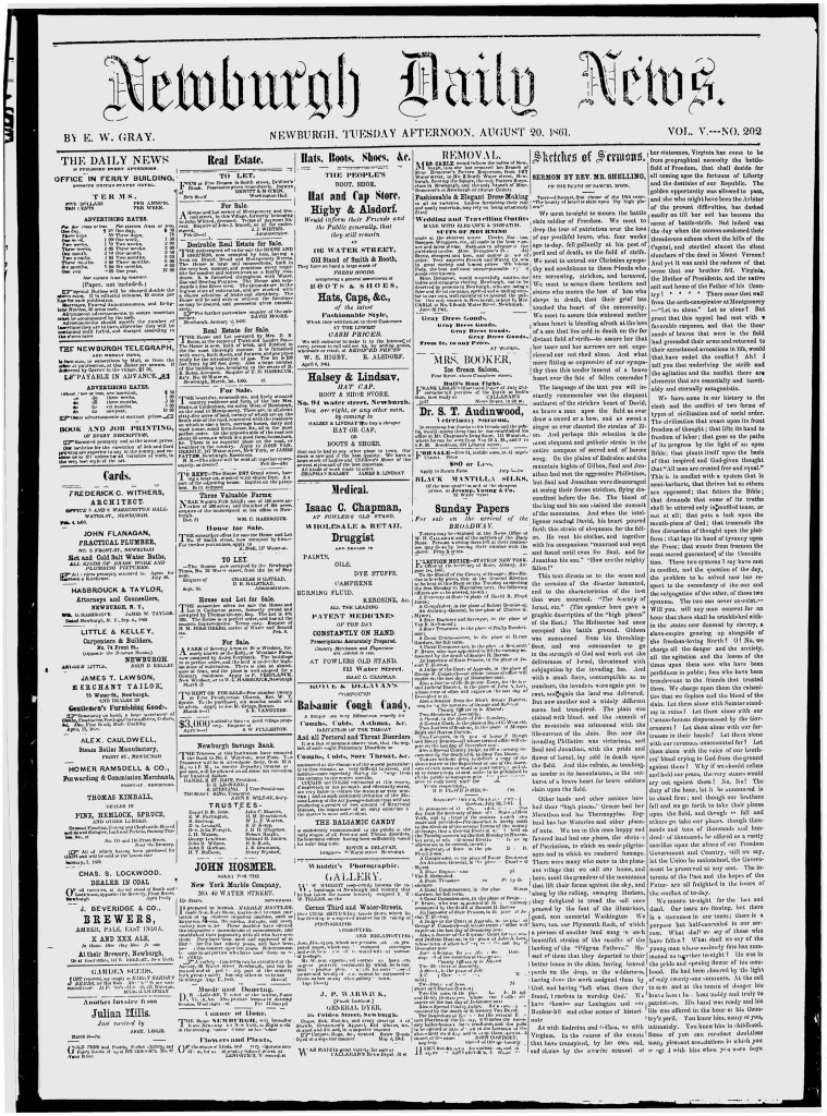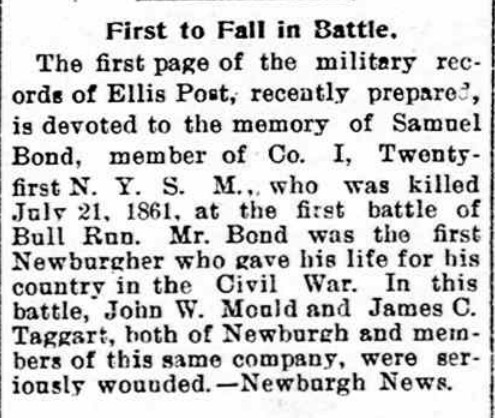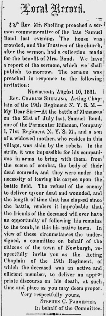 Samuel O. Bond was the son of John Ambercrombie Bond and Harriet (Cromwell) Bond, born on January 3rd, 1840. They are buried in Rossville in the same plot, along with other family members. I don’t believe Samuel is buried in Rossville based on a newspaper article from the Daily News, published on August 19th, 1861. In this article it states his comrades could not recover his body. There is a record of the sermon by the Rev. Charles Shelling, the Acting Chaplin for the Regiment, in the August 20th, edition of the Newburgh Daily News.