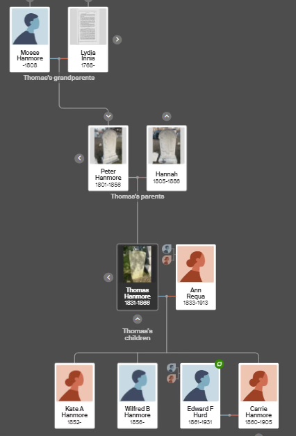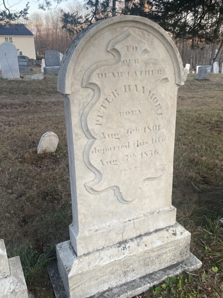 Researching this name failed to find any information. The marker, which was supplied by the government, failed to record any dates which contributed to my puzzlement. So, taking a look at the location of the marker, the adjacent two graves are for Peter Hanmore and Hannah Hanmore. Apparently the government added a “d” to the surname. Could Peter and Hannah be Thomas’ parents? You betcha!